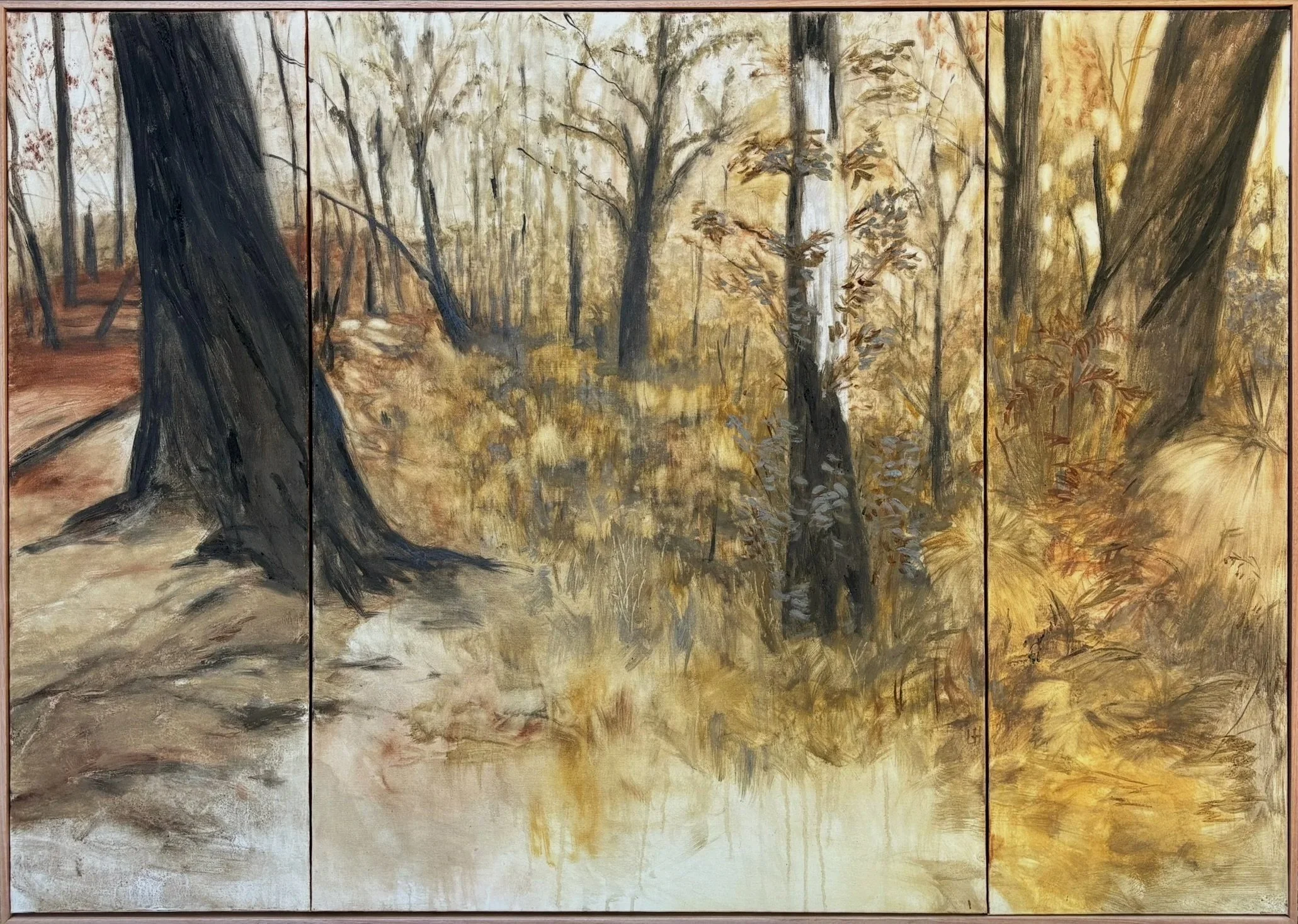 My interpretation on the remarkable Australian landscape and how it is pioneered by plant life in the recovery after bushfire. Painted with earth pigment and bushfire charcoal collected from the Gurdies nature reserve (Victoria) after fires in Summer 2024, a reflection on our environmental and Australian impressionist heritage.